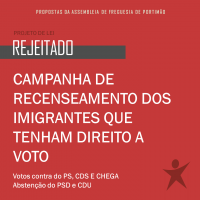 Recomendação apresentada pelo Bloco de Esquerda na Assembleia de Freguesia de Portimão a 22/04/2025, para que fosse feita uma campanha de apelo ao recenseamento eleitoral dos estrangeiros com direito a voto (isto é, UE, Brasil, Cabo Verde, Reino Unido, etc.). Rejeitada com os votos contra do PS, do CDS e do Chega e com a abstenção do PSD e da CDU.