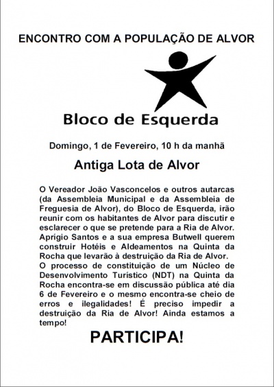 O Vereador João Vasconcelos e outros autarcas (da Assembleia Municipal e da Assembleia de Freguesia de Alvor), do Bloco de Esquerda, irão reunir com os habitantes de Alvor para discutir e esclarecer o que se pretende para a Ria de Alvor. Aprígio Santos e a sua empresa Butwell querem construir Hotéis e Aldeamentos na Quinta da Rocha que levarão à destruição da Ria de Alvor.